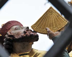 市議宴会館の仕掛け時計マイスタートルンクに 毎正時にティリー将軍とヌッシュ市長が現れる* |