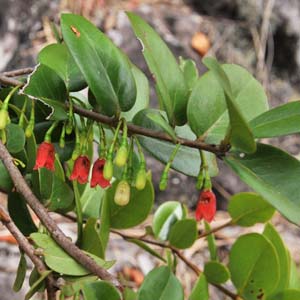 | 赤い房の付いた花が咲いている | 着生植物も多い |