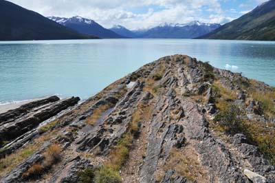 | 氷河展望台のある岸の地層は、傾斜した古い堆積岩だろうか。 | ||