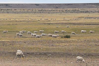 | 朝の食事中のグアナコ* グアナコはラクダ科で、アルパカ、リャマと同様に、アンデス原産の動物であるが、 乱獲の結果、絶滅が危惧され、アルゼンチンでは貴重な動物として保護されている。 |