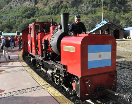 | 世界最南端を走る観光列車「地の果て号」には、悲哀の歴史が秘められている。1883年アルゼンチンのロカ大統領は、フランスのニューカレドニア、イギリスのオーストラリアに倣って、フエゴ島に刑務所を作る法律を提出した。 この鉄道は、1910年に囚人によって建設され、ナンキョクブナの木を伐採する囚人(鎖で繋がれていた)と伐採した木材を運んだ。木材は機関車の燃料、刑務所の暖房に使われた。1930年には囚人の数は600人を越えた。囚人列車の元の走行距離は25kmであったが、現在は7kmの部分を整備して観光列車としている。 |