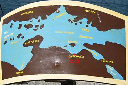 エンセナーダ湾は、ビーグル水道を挟んで対岸はチリ領。 ここには「地の果ての郵便局」がある。写真左下の赤いポストから家族に郵便を出した。 |