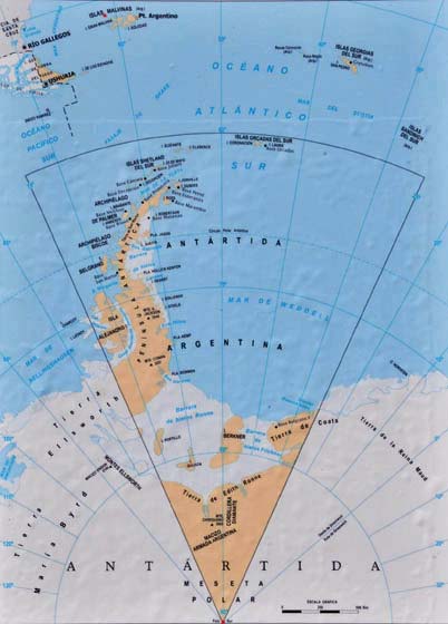 現地に掲示されている地図は、アルゼンチンが領有権を主張している南極部分がフエゴ島と合わせて表示されている。 |