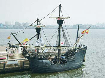| アルマス広場に建つマゼランの像 マゼランは自分が発見した海峡を見ている。下の原住民の足に触ると無事この地に帰ることができるという。 |