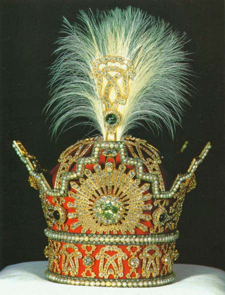ファラー王冠* ファラー・パーレヴィ王妃が国王の戴冠式の時に使用した王冠で、ダイアモンド1,469個、エメラルド36個が用いられ、総重量1.48kg |