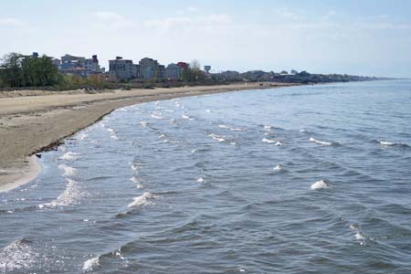 | カスピ海の湖岸に打ち寄せる波 平均塩分濃度は1.2%で、海水のほぼ3分の1、 舐めてみると、僅かに塩辛い |