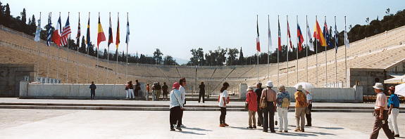 | アテネ競技場 1896年第1回近代オリンピックが開催された。座席は大理石で5万人収容。見学した当日(2000年5月19日)はシドニーオリンピックのためのギリシアからオーストラリアへの聖火伝達式が行われた。この競技場のトラックはカーブがきついため、2004年のアテネオリンピック用に競技場を新設するという。 |
