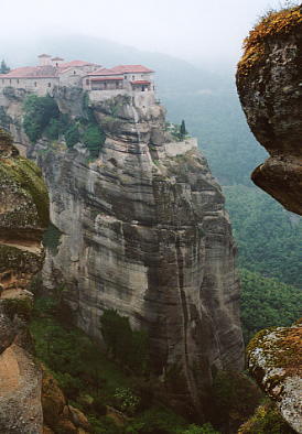 | 大メテオラ修道院 メテオラとは「空中に浮いている」という意味 浸蝕と風化による奇岩の上に建つ修道院群は、少しでも神に近づこうというのか、それとも俗界から離れようというのか |