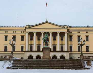 | カール・ヨハン通りを見下ろすように建てられた王宮は1822年に着工し1848年に完成した。 王宮前には当時のスウェーデン国王カール・ヨハンの馬上の銅像がある。 因みに、ノルウェーは1814年から1905年までスウェーデンの支配下にあった。 |