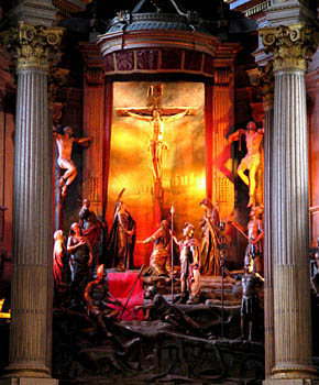 | 階段の上にあるボン・ジェズス教会は1784年から1811年に建てられた新古典主義様式 | 教会の祭壇には、キリストの処刑の場面の強烈な像がある |