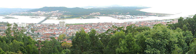 | 標高249mのサンタ・ルチア山展望台から望むリマ川とヴィアナ・ド・カステロの町 右端は大西洋で、この町は造船業ではポルトガルで第2と聞くが、遠望では大きなドックは見当たらない。 |