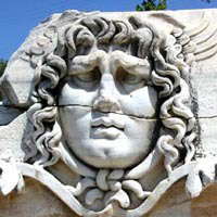 | 今も残る直径2mの石柱3本が当時の偉容を伝えている。 | 正面奥の壁には、「メドゥーサの首」が睨みをきかせている。 |