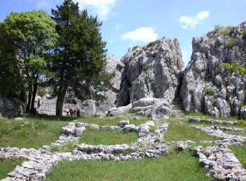 | 岩の表面に沢山の穴が開いているので鳩の家といわ れる。事実、ハトの糞を集めてブドウの肥料にしていた。 |