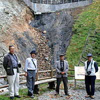 | 鳳来寺山自然科学博物館から近い中央構造線・鳳来寺山露頭 (向林露頭)を訪ねる。現地は草に覆われていて見落としそうであるが、分かりやすい案内板に助けられる。 |