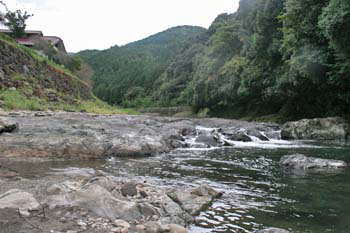 左の図で右に向かって撮った写真 砥部川の河床の「かすが淵」付近 |
