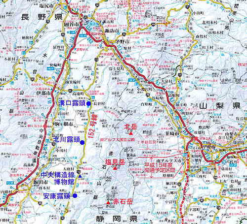 | 長野県大鹿村付近の中央構造線露頭の見学地図 |