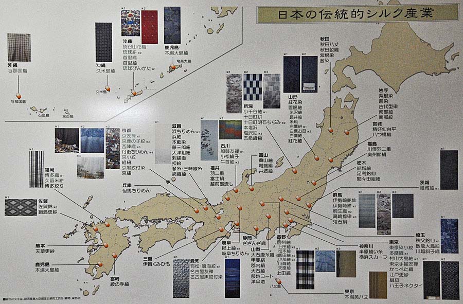 | 日本全国にそれぞれ独特の伝統的絹織物がある。群馬県立「日本絹の里」では、それらを総覧できる。開館15周年を迎えたこの博物館は、養蚕、製糸、機織り、絹織物など日本の絹文化を紹介する貴重な博物館である。 |