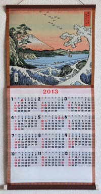 | 工場では、土産用の「織物カレンダー」が織られていた。ジャカードは機械上部にあり、紋紙を使わないダイレクト・タイプで、電気と磁石を使いコンピューターで操作する。 | 浮世絵部分だけ、5連で織っていた。 「たて糸」はテトロン、「よこ糸」はアセテート |