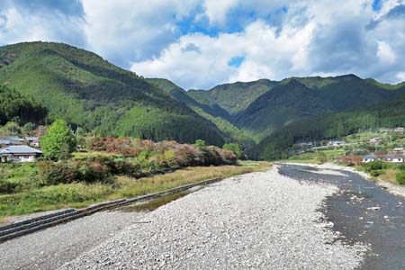 | 発車してすぐ熊野川の河口を鉄橋で渡る | 車窓から名産のミカン畑が見える |