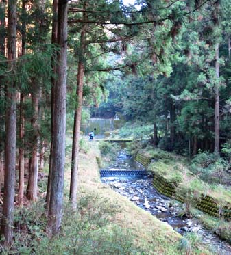 | 東屋を過ぎて下ると日置川に出る | 川縁に水垢離の標識。ここで、心身を清浄にしたのであろう。 |