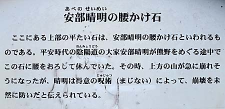 | 美滝山荘を出て大門坂に行く途中に、旧史跡「清明橋の石材」がある。 陰陽道の安部清明の庵の近くの橋を「清明橋」と呼んでいた。昭和45年に地形が変わったため橋材をここに移したものという。 |