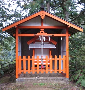 | 神倉神社の神橋の正面に祀られた猿田彦神社・神倉三宝荒神社 猿田彦は、高天原から地上に降る天孫ニニギノミコトを降臨地・日向高千穂まで導いた国津神。一方の神倉三宝荒神社の祭神は火産霊神と誉田別命で、火産霊神(ホムスビノカミ)とはイザナギとイザナミとの間に生まれた火の神、誉田別命(ホンダワケノミコト)は応神天皇のこと、どうして神倉神社に祀られているのか私には分らない。 |