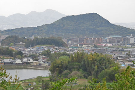 | 甘樫の丘から東方を眺める 遠方の山は左から音羽山、経ヶ塚山、熊ヶ岳の音羽三山 手前中央に飛鳥寺 |